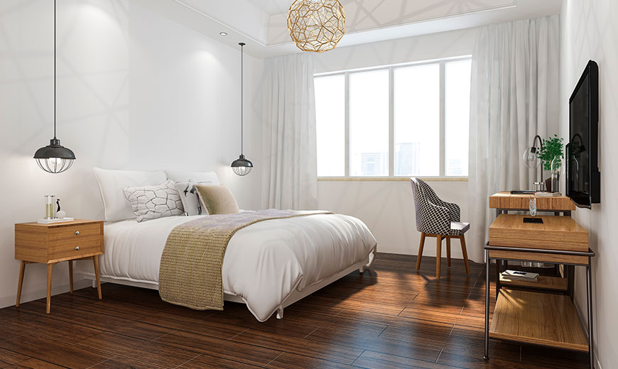A blend of modern furniture, premium textures, soft lighting, and statement headboards for a hotel-like experience.
